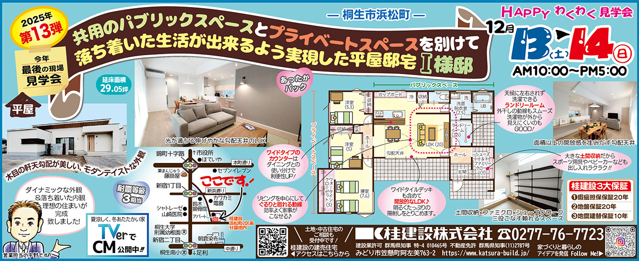 【桐生市浜松町】第13弾!木目の勾配軒天が美しい、モダンテイストの外観。リビングを中心に家事が効率よくこなせる動線。玄関・リビングのどちらからも回れる便利な水回りは、プライベートスペースと分けることで、落ち着いた暮らしを実現♪大容量の土間収納には、ベビーカーや外で使うアイテムをすっきり収納!快適とデザイン性を両立させたI様邸完成現場見学会開催 2025.12.13(土)12.14(日)